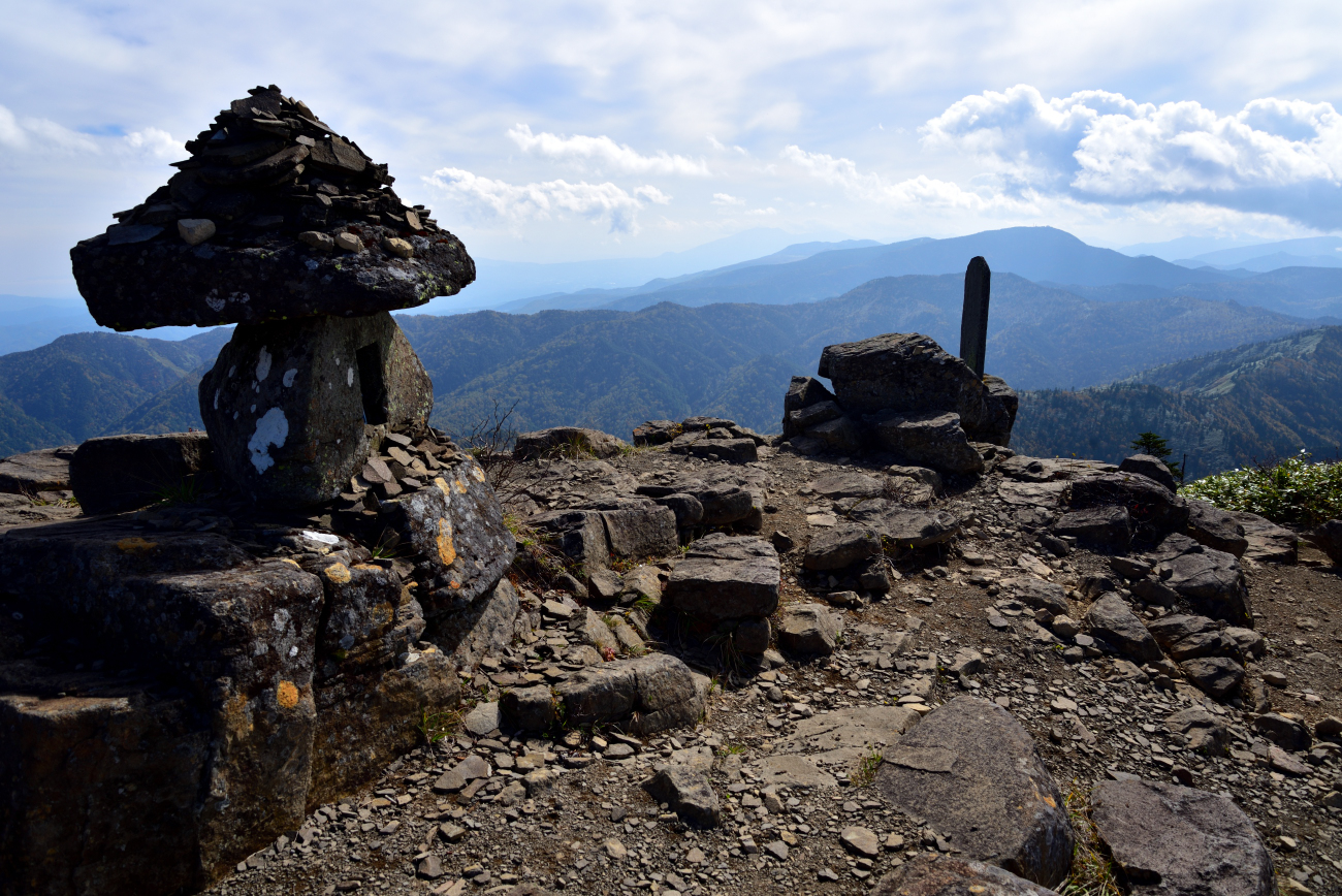 ~ 裏岩菅山(12:26) ~ 岩菅山(13:14) ~ ノッキリ(13:34) ~ アラタイ沢出合(14:28) ~ 登山口(14:55)