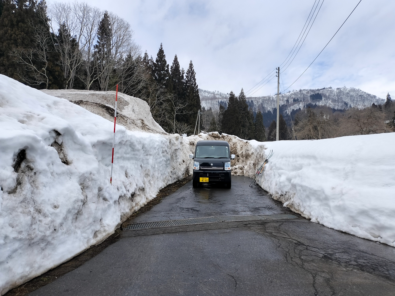 ここに車を停めて出発。階段を作らないと雪壁を登れない。