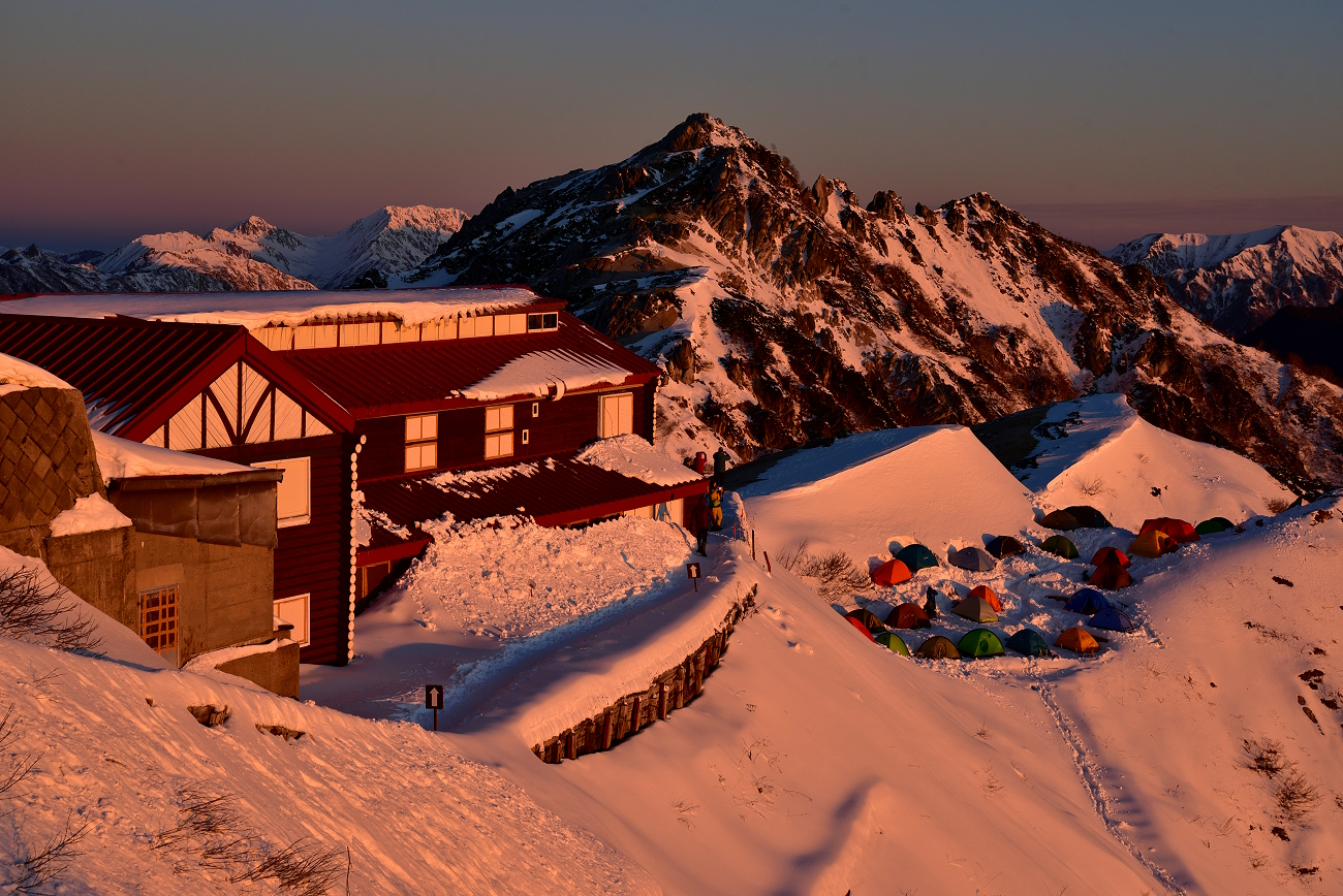 連休の為、大勢の人達が山荘の前に集合。まるで夏山のような賑わいだった。