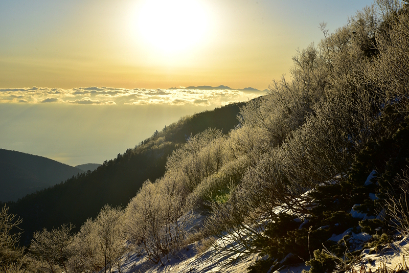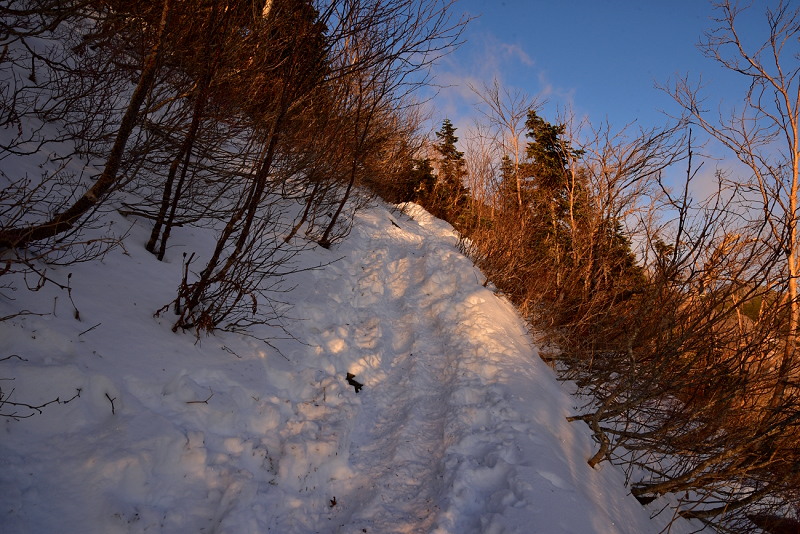 早めに出発して明るくなった頃に蝶ヶ岳に到着するように三股を出発した。凍結した登山道には謎の血痕があり、ちょっとビビる。