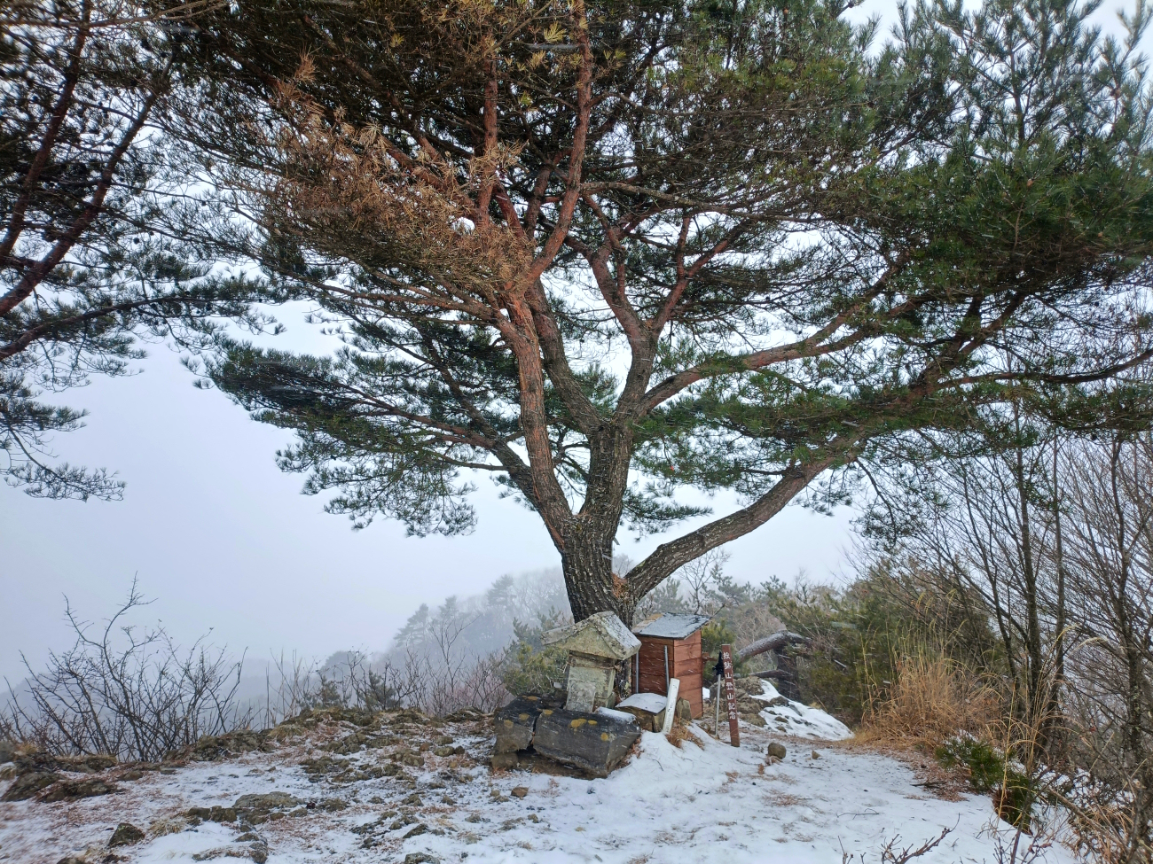 何も見えません。天気悪いです。誰も居ないと思っていたら違う登山口から男性が登ってきました。